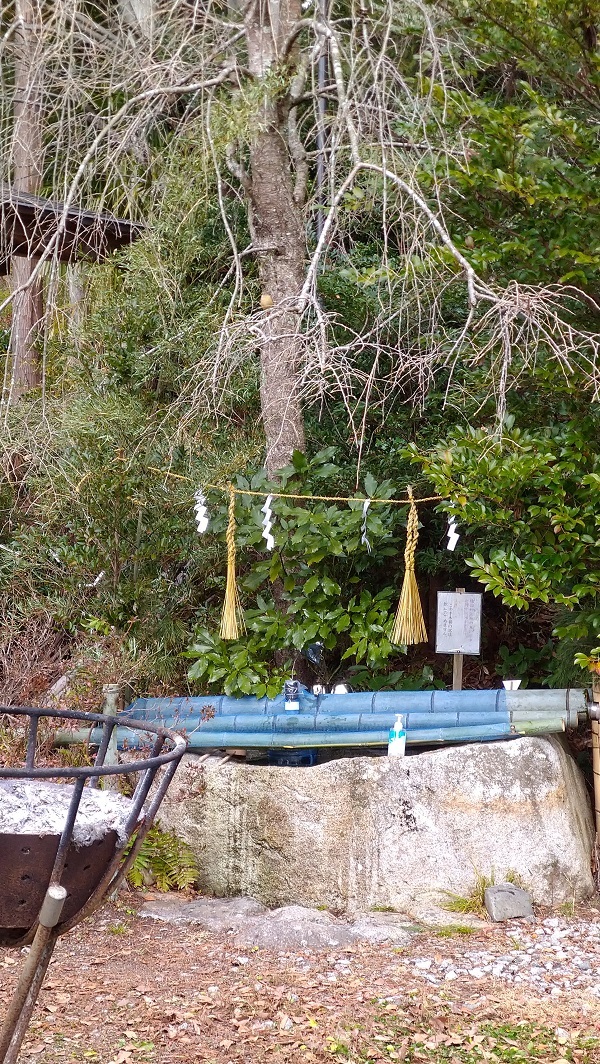 | 霊峰ニツ箭の麓の片石田から巨岩を掘り出し、割り、水受けを削り出した珍しい手水所です。 |